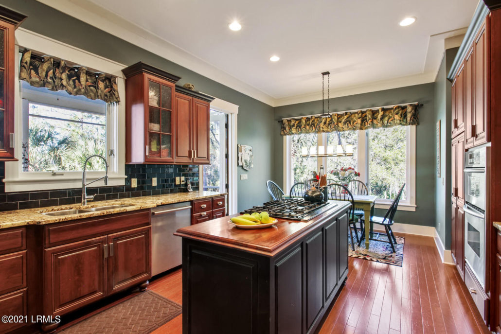 The chef’s kitchen features Bosch appliances including a 5-burner gas stove, custom cabinetry with granite countertops and an oversized island. Send me more about this home in Callawassie Island!
