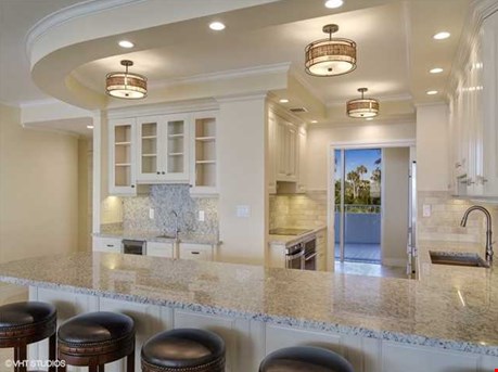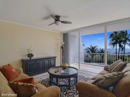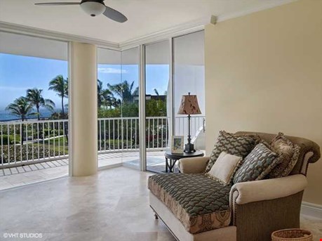 Enjoy unobstructed views of the Atlantic Ocean from this newly renovated condominium residence, with its sheltered curving balcony complimented by distinctive Travertine tile. A well-disguised Murphy bed turns this typically two-bedroom residence into three.