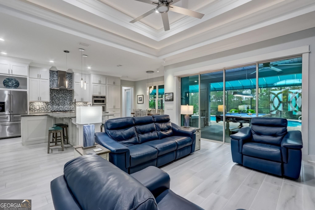Throughout the main living spaces there are 14-foot ceilings and flooring that’s a blend of LVP and porcelain tile.