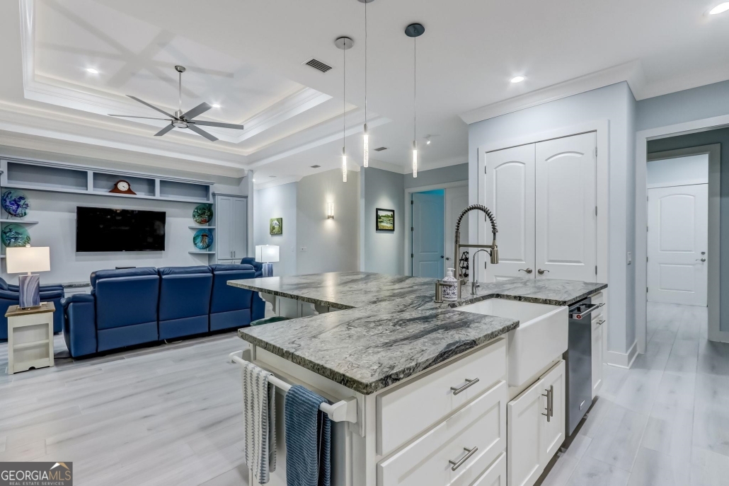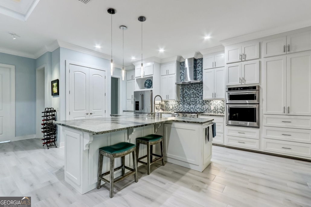 The kitchen’s extra-large island has a leathered finish and the appliances are top-of-the-line, including a six-burner gas stove and a Rinnai tankless hot water heater. Send me more about this home in Osprey Cove!