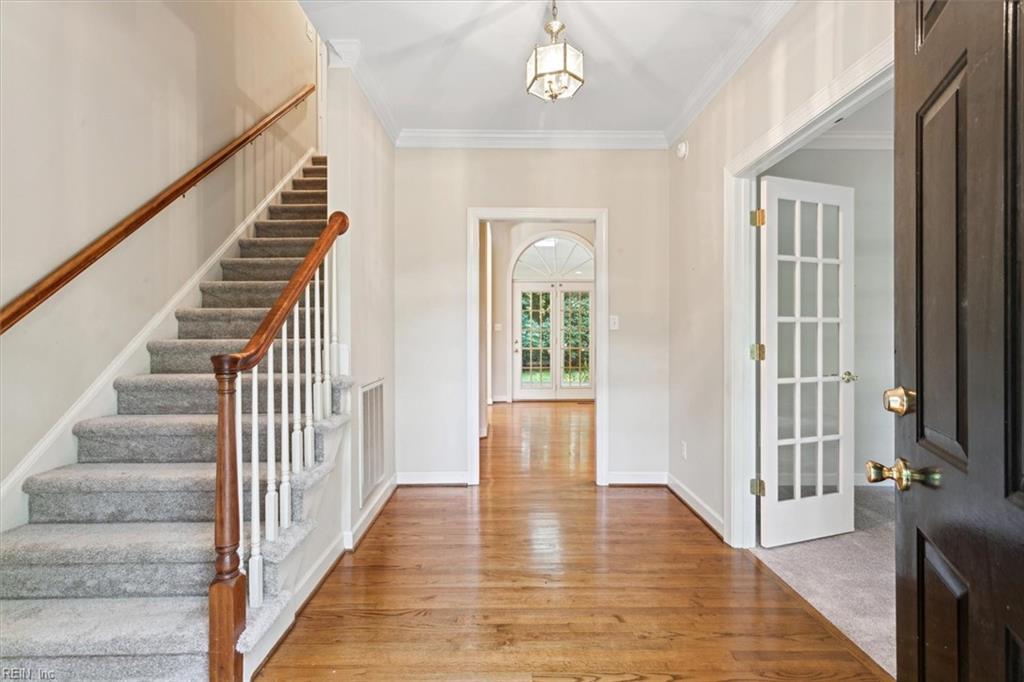 - Polished hardwood flooring, crown molding, baseboards