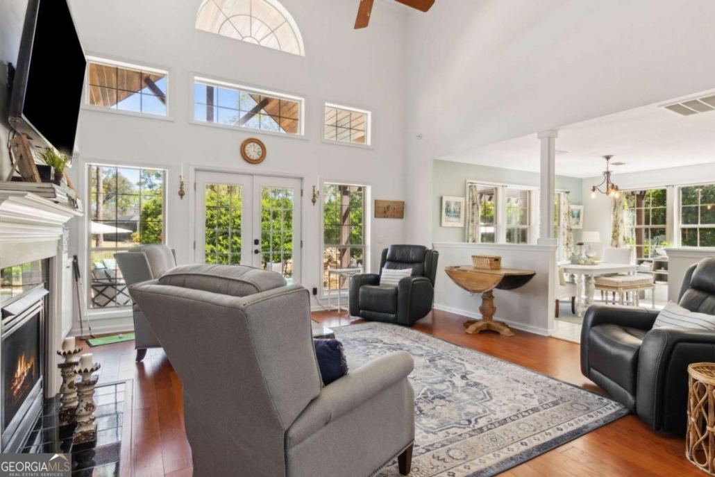 This stylish, 2,184-sf home at 1034 Greenwillow Drive in Osprey Cove, GA has a resort-style private pool and is surrounded by lush landscaping.