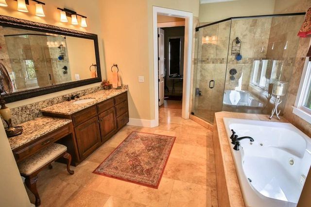 - Large stone patio with gas grill, refrigerator, plenty of seating and stone fire pit