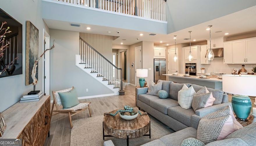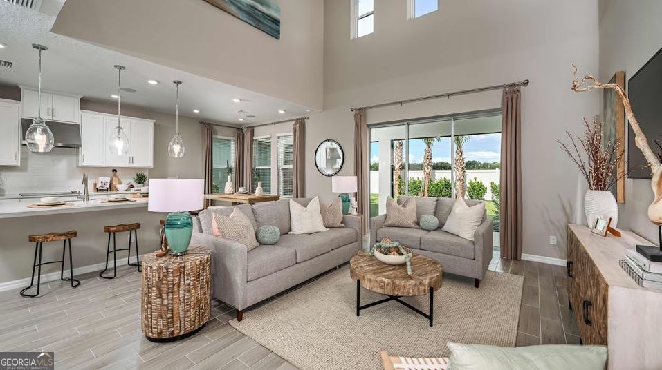 The main living area on the ground floor combines the kitchen, casual dining area, great room with two-story high ceiling.