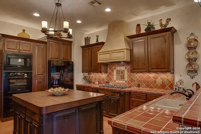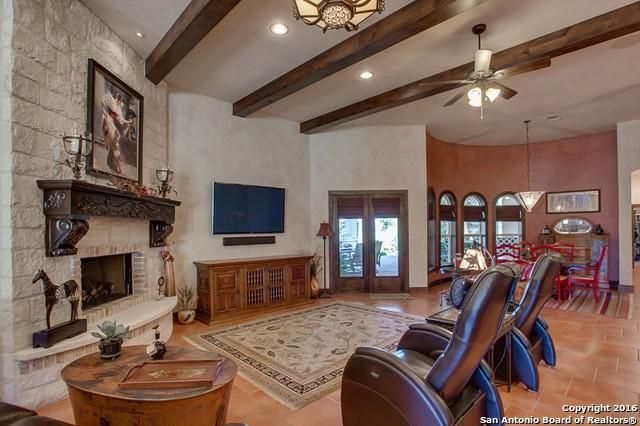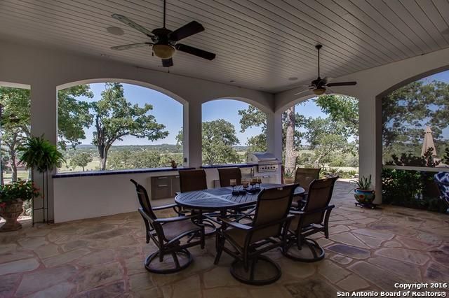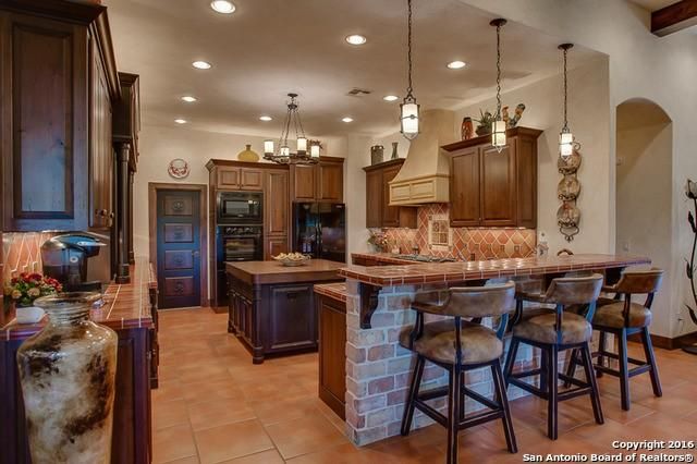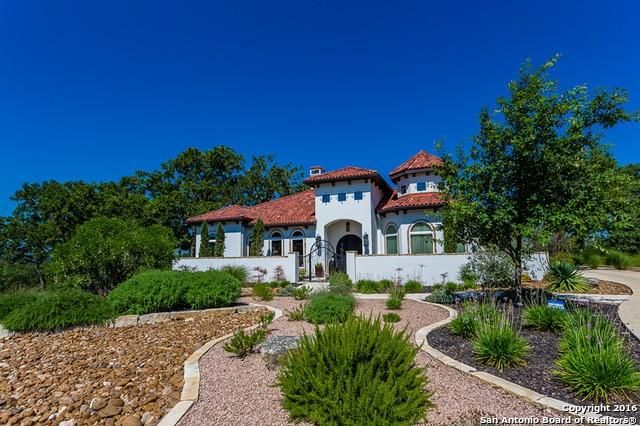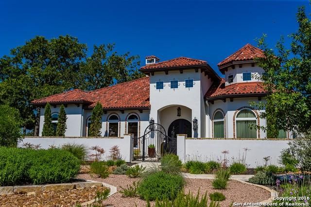 This Spanish Colonial-style home features quality finishes throughout. It is sited on a double lot with a front-entry courtyard and Hill Country views off the back patio.