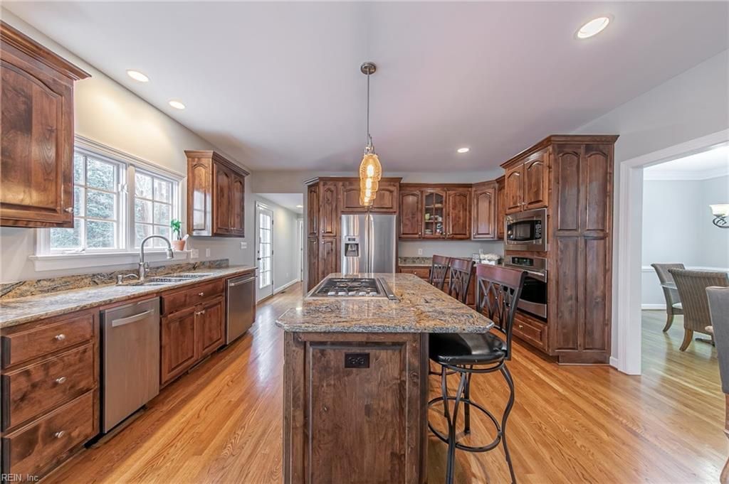 - Kitchen with custom granite, gas cooking, center island stainless appliances