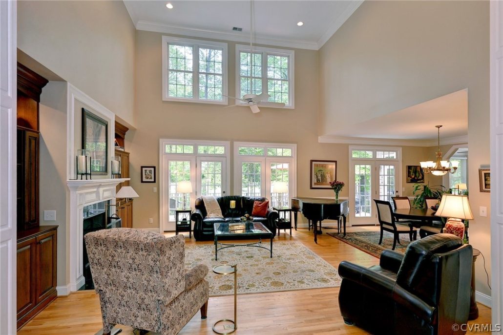 An impressive foyer leads to a two-story family room featuring a wall of windows, fine trim, custom built-ins and a gas fireplace.