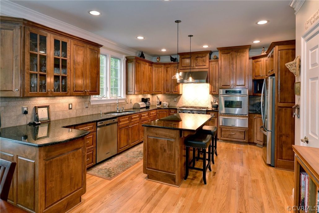 Kitchen appointments include a Thermador gas cooktop, large island, generous prep space and storage.