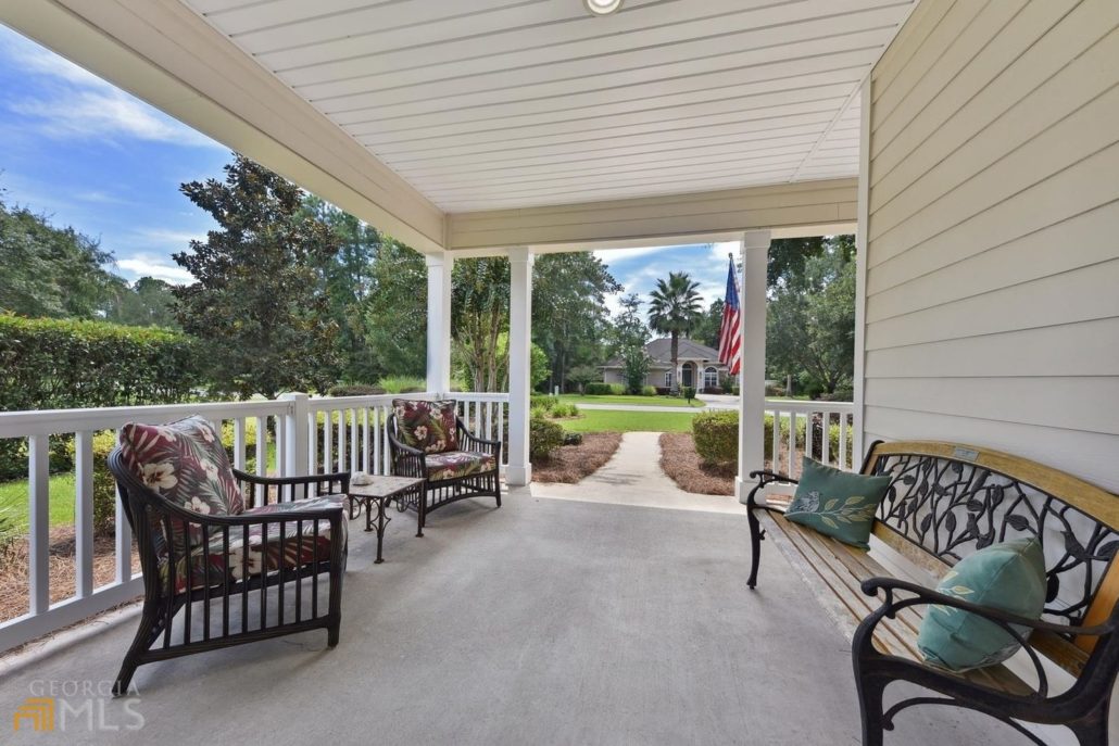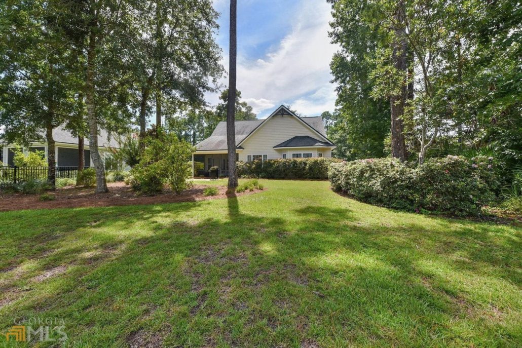 This attractively landscaped lakefront home at 123 Millers Branch Drive in Osprey Cove, GA has a wide, welcoming front porch and 2,558 sf of living space.
