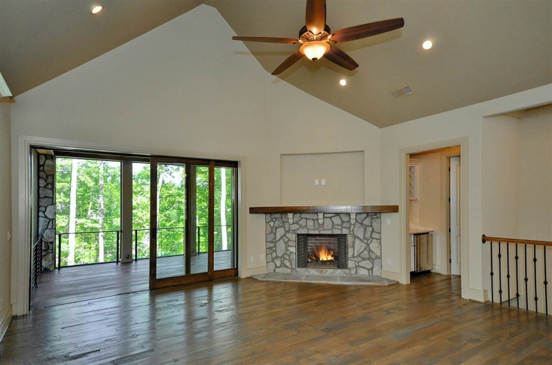- Great room with a soaring ceiling plus fireplace with rock surround