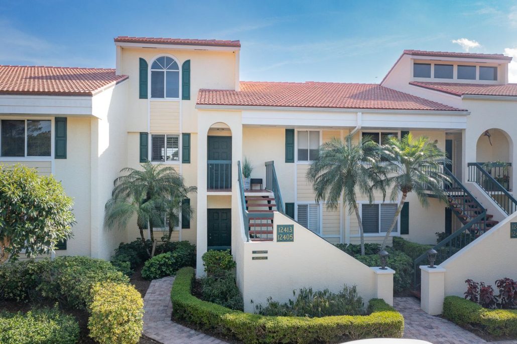 This 1,619-sf condominium home at 12413 NW Harbour Ridge Boulevard Unit 4-6 in Harbour Ridge Yacht & Country Club has pleasing views of a pond and of hole No. 1 on the River Ridge Course.