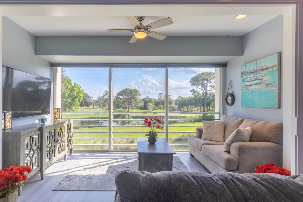 Enjoy golf and water views from inside or out.