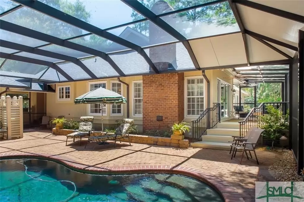This single-level 2,842-sf home at 13 Windwalk Lane in The Landings is well sited on a private wooded lot along a quiet cut-de-sac. It has a private pool with bathroom and an oversized screened porch.