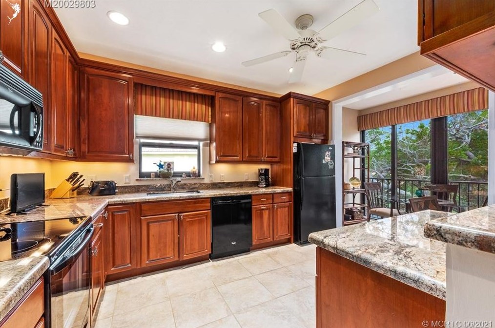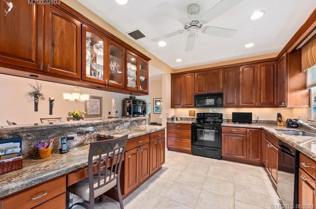 - Kitchen w/ tile floor, granite counters, built-in desk