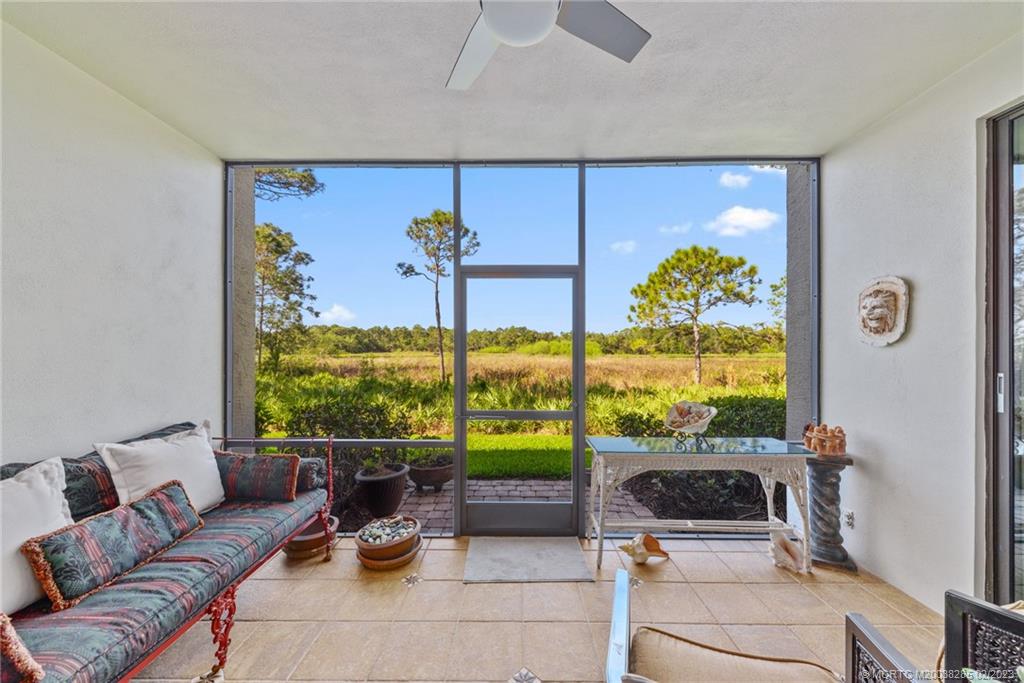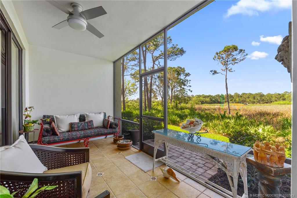 This first-floor condominium at 13458 Harbour Ridge Boulevard Unit 5B offers excellent views from its spacious screened-in patio.