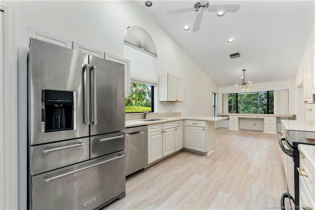 - Kitchen w/ white cabinetry, stainless steel appliances