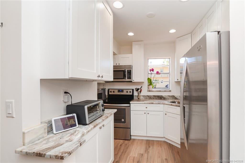 - Quartz kitchen counters, white cabinetry