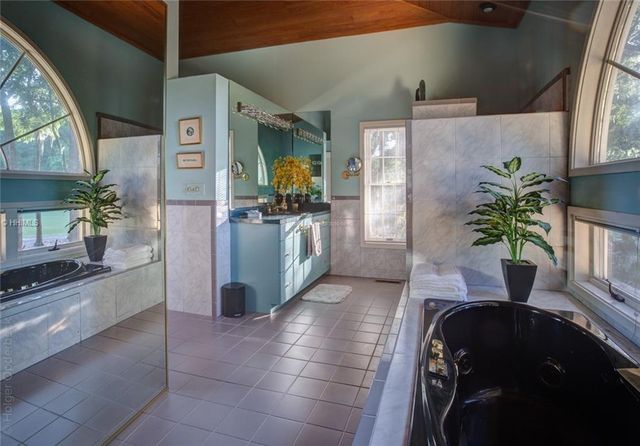 - Master bath with custom surfaces, Roman tub, palladian window