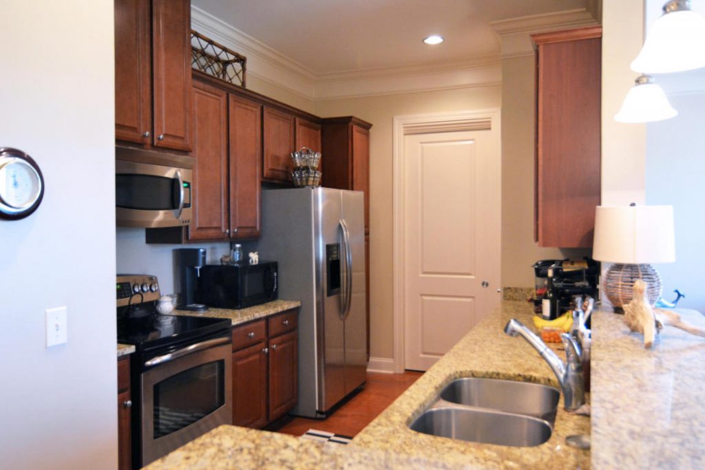 - Galley-style kitchen with stainless steel appliances and granite countertops