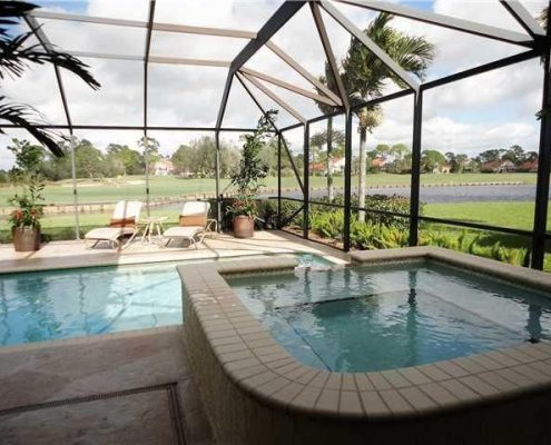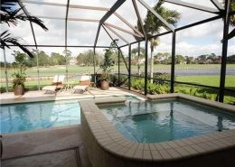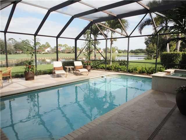 This custom Barcelona-design residence is wonderfully sited on a spacious lot that overlooks the lake-surrounded 10th green of the community’s Pete Dye Course. Its he expanded screen-enclosed patio has an oversized heated pool and spa.