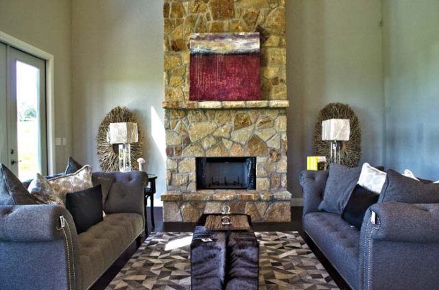 - Hand-troweled walls, knotty alder doors and cabinetry, stone fireplaces