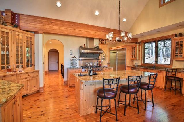 - Kitchen with wet bar, cook’s station, serving island and vaulted ceilings
