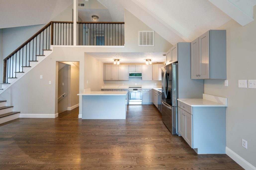 The main level has a comfortable living room with fireplace and an open kitchen adjacent to it, with glass-fronted oak cabinets and a convenient breakfast nook.