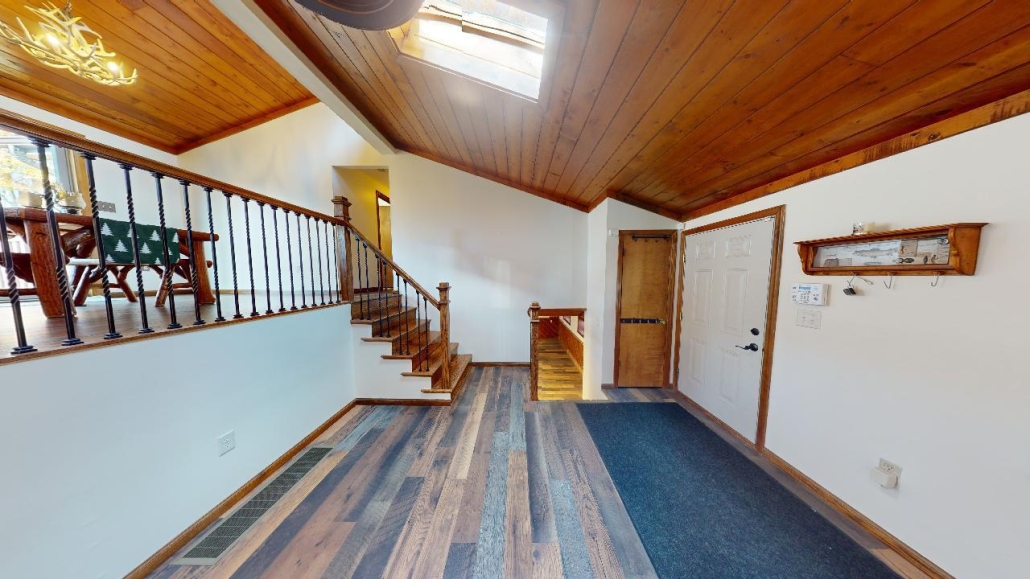 - Dining room w/ plank ceiling, antler chandelier