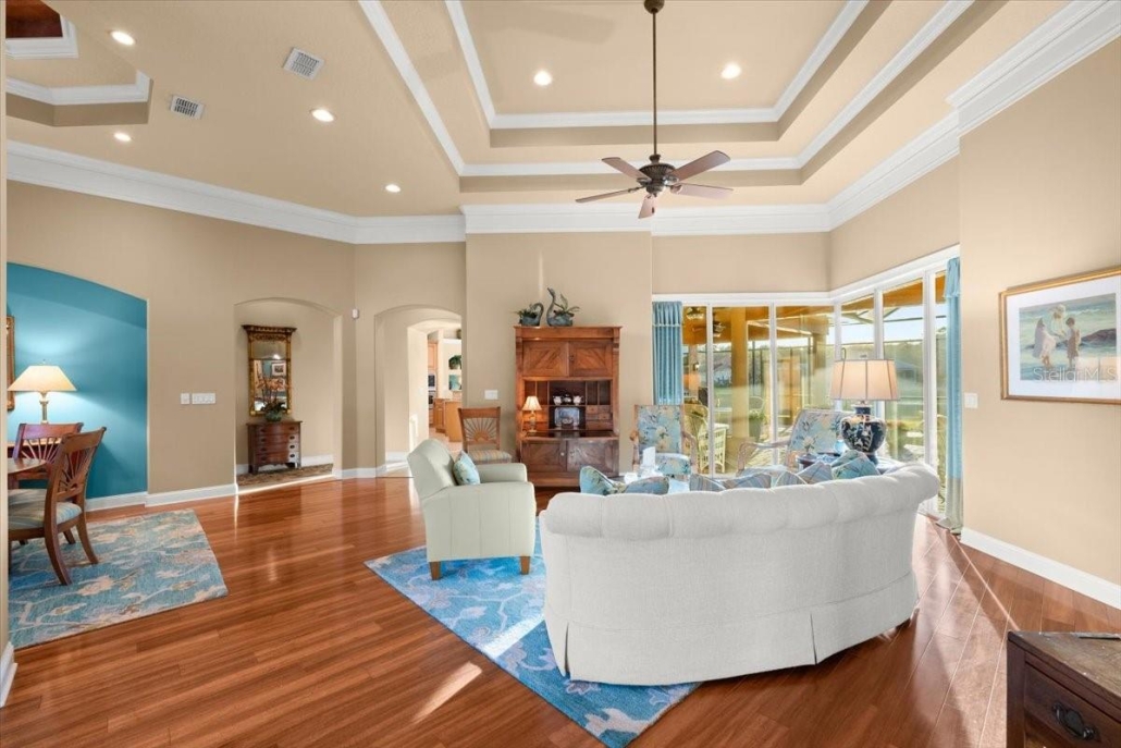 The owner’s suite has a stepped ceiling with crown molding and French doors leading to the pool lanai. Send me more about this home in Hammock Beach!
