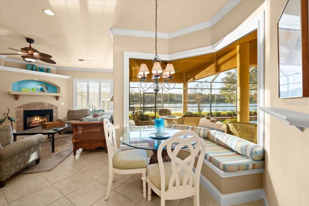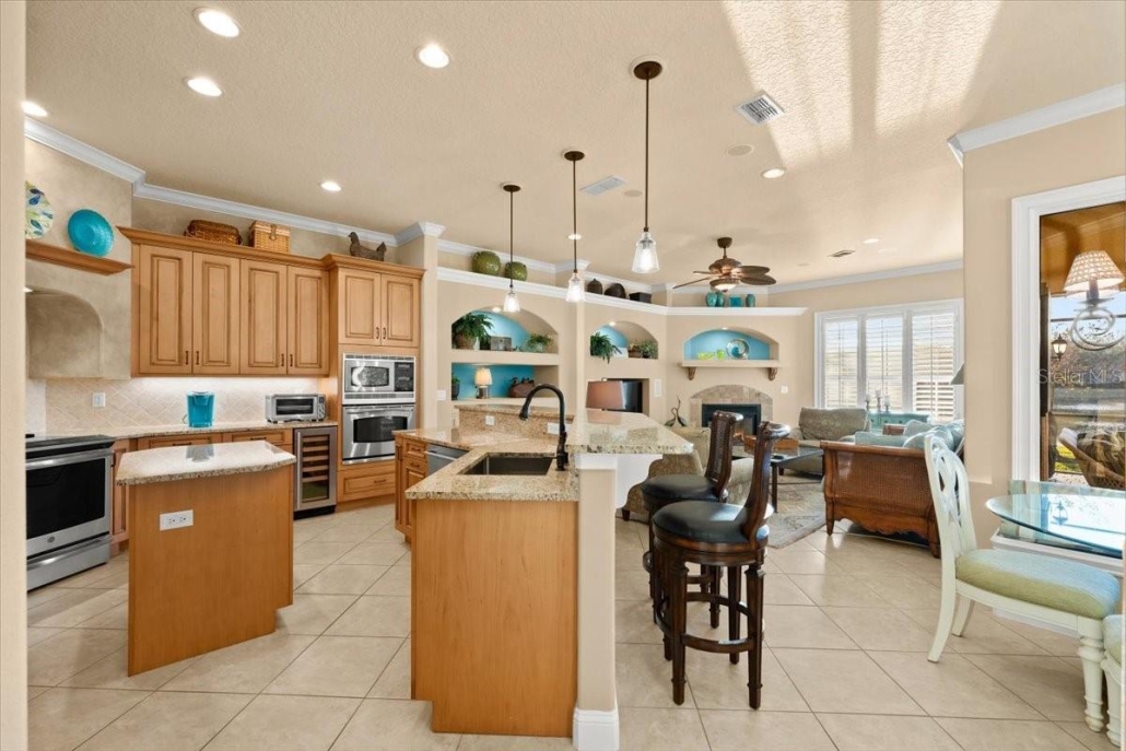 The family room is ideal for entertaining, with a custom-built entertainment center, a gas fireplace and pocket sliding glass doors that open to the pool lanai.