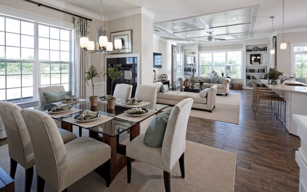 This open-concept Quincy II home at 306 Heritage Shores Circle in Heritage Shores has 10-foot ceilings and a large, well-lit family room with a gas fireplace.