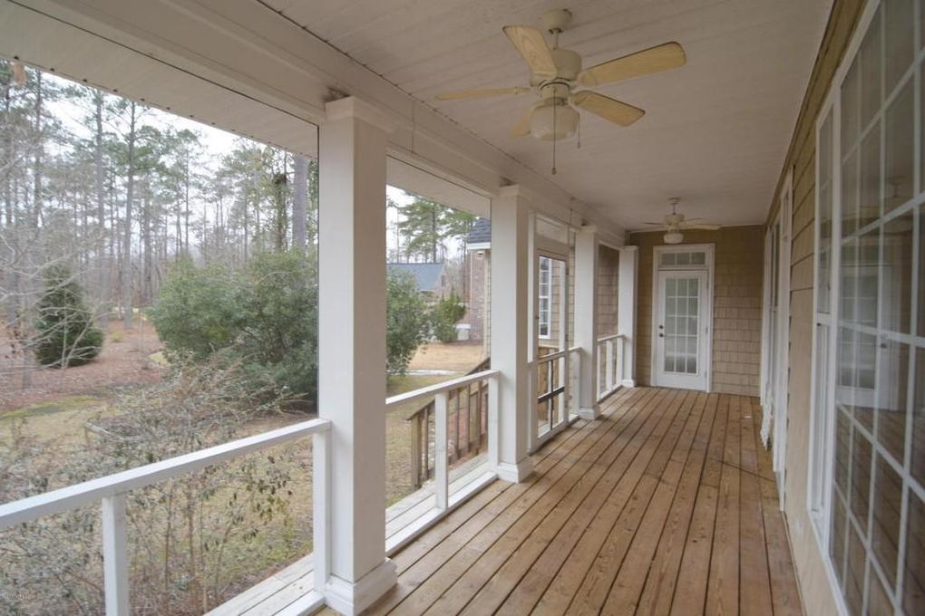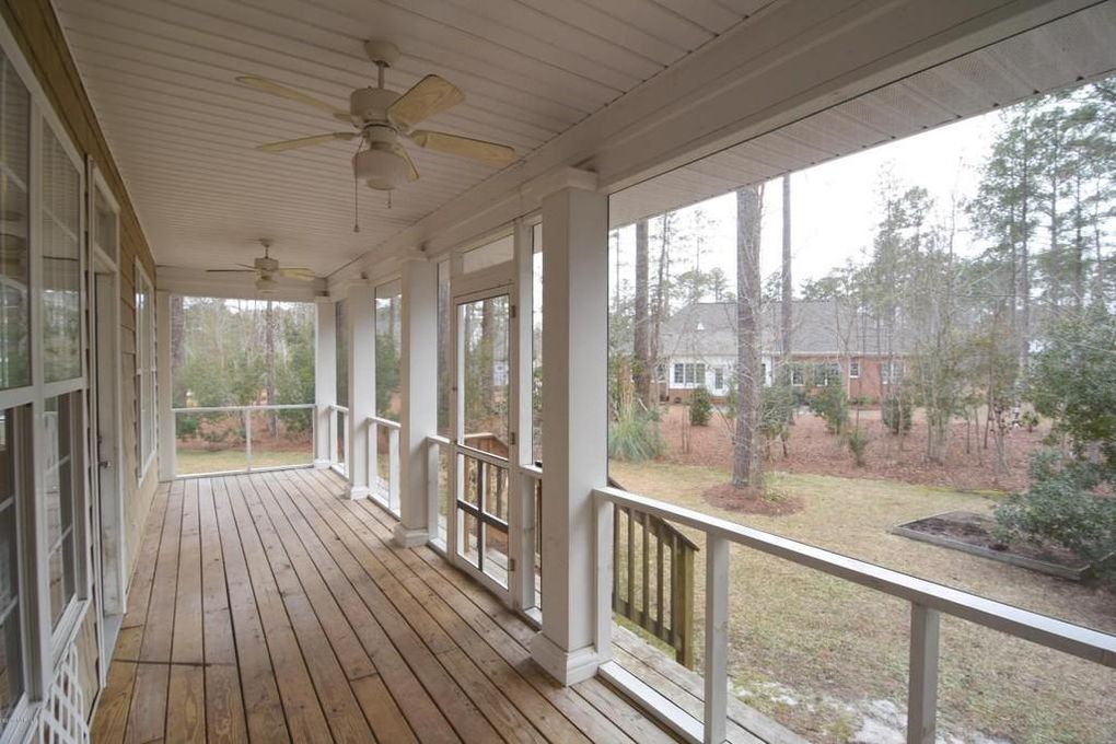- Master suite with vaulted ceilings, private porch, dual vanities, large soaking tub