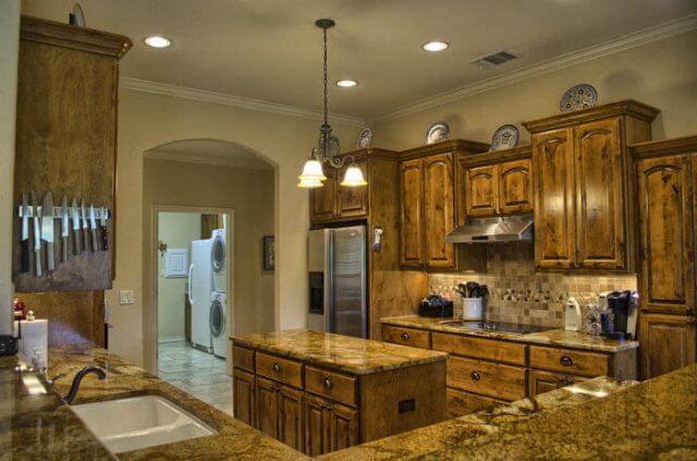 - Kitchen with granite countertops and knotty alder cabinets