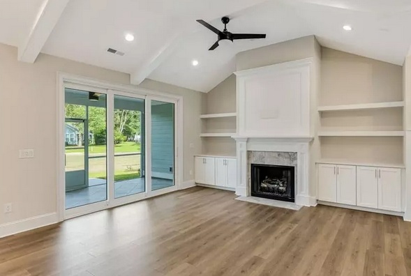 The light-filled interior includes vaulted ceilings with faux beams, built-in shelving, a gas fireplace, and telescoping glass doors leading to a spacious screened porch.