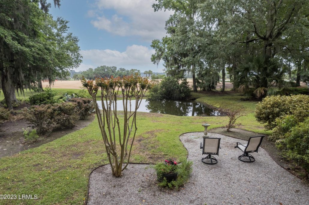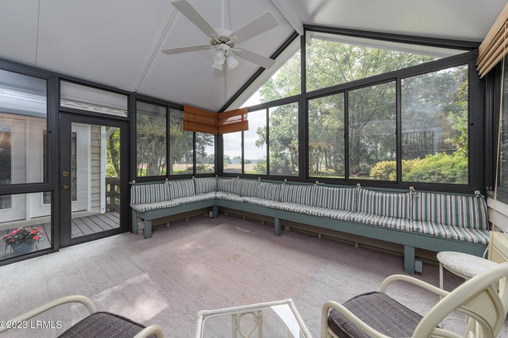 From the screened porch of this single-story Club Cottage at 4 River Marsh Lane in Callawassie Island, SC there are views of golf, a small pond and distant marsh.