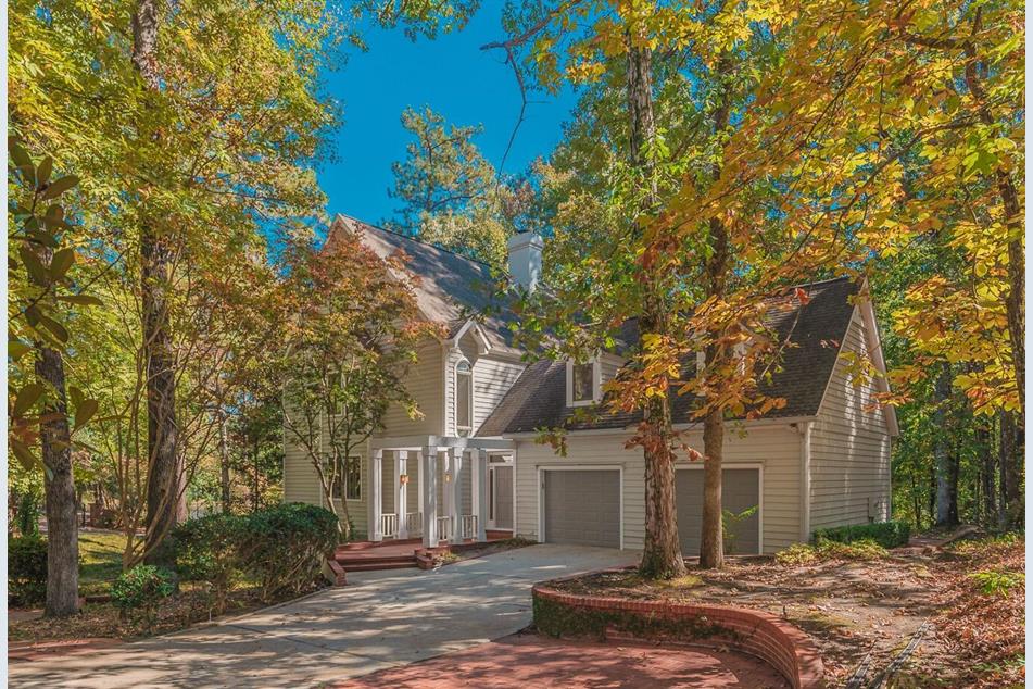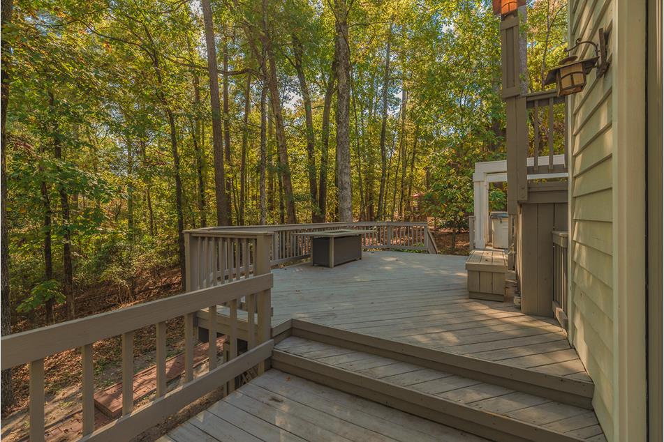 This designer-renovated luxury home sits on a large wooded lot at 40 Wax Myrtle Circle in Woodside, SC with a water view.
