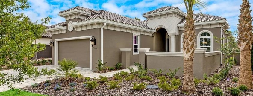 This new-construction home at 407 Bourganville Drive is set on a golf and lakefront site in Hammock Beach, FL.