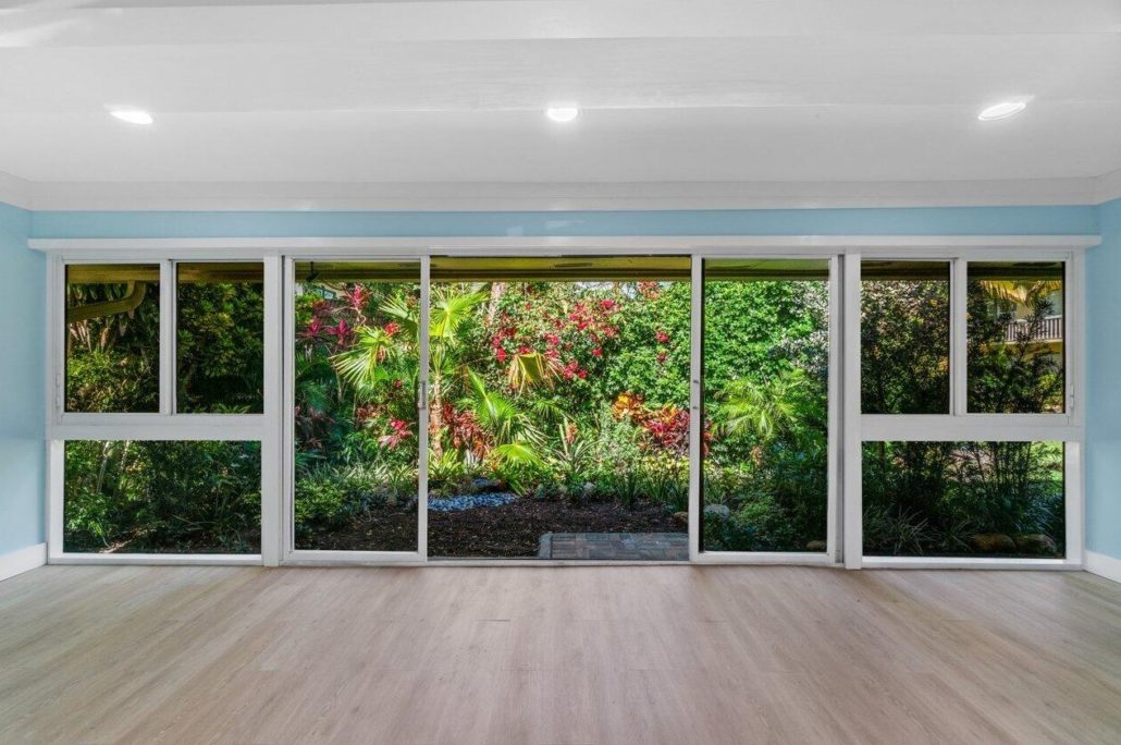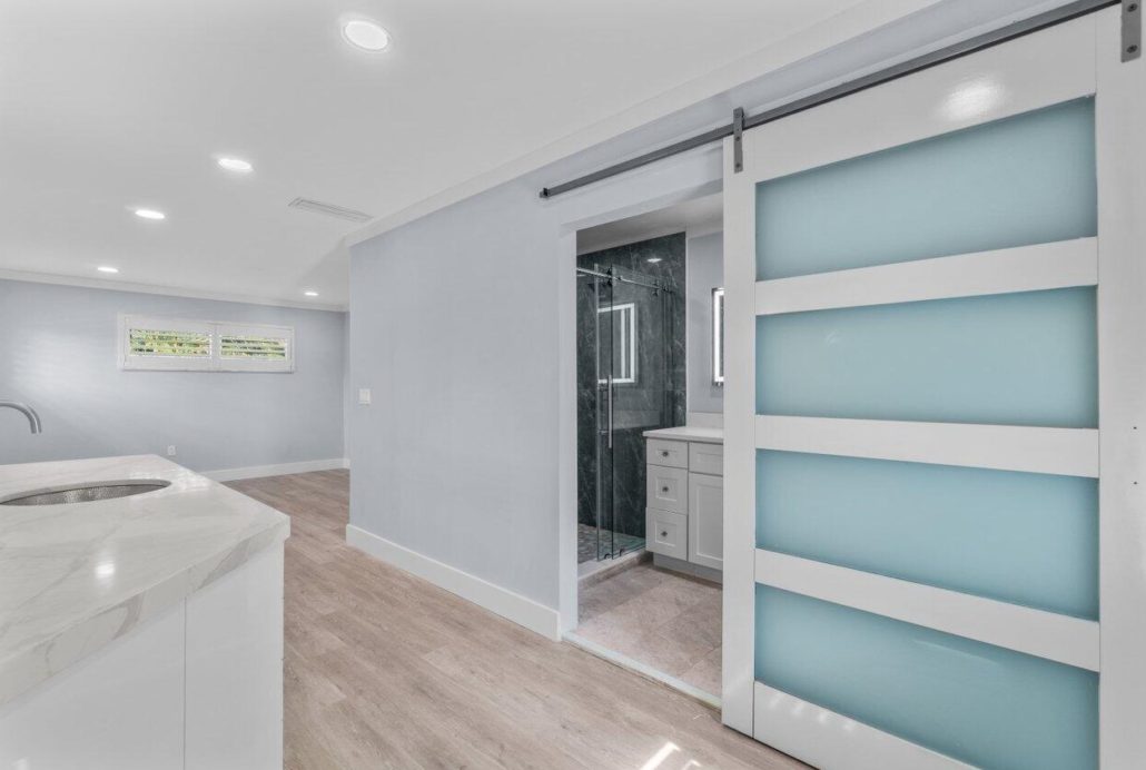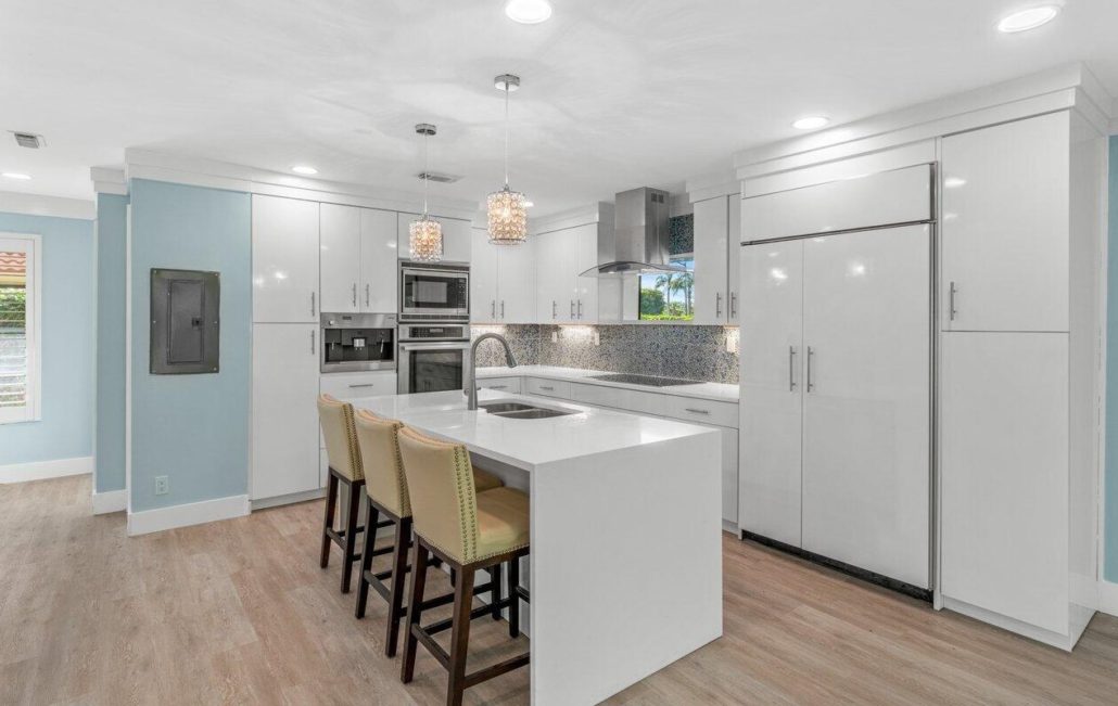 The home’s open kitchen features white cabinetry with a blue glass mosaic backsplash.