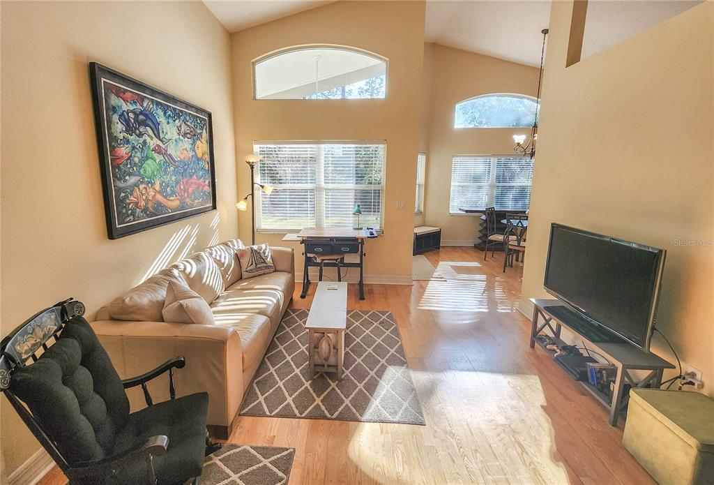 The open layout includes vaulted ceilings.