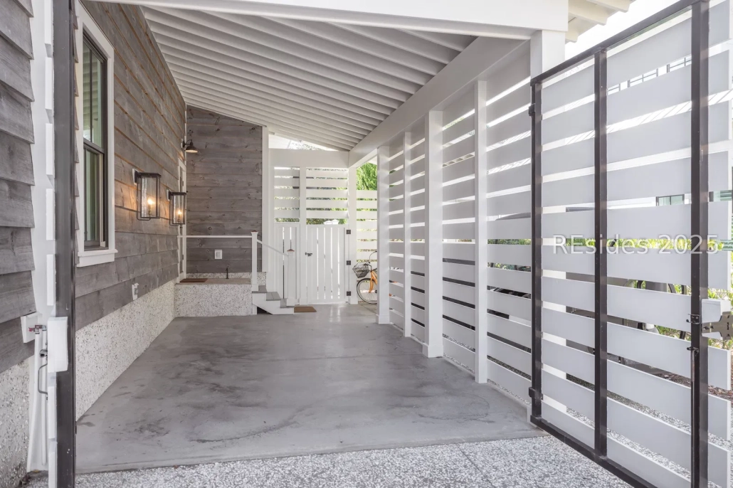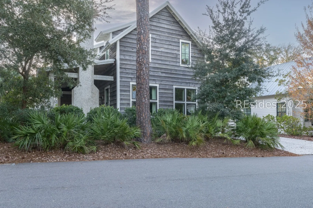 This thoughtfully crafted cottage at 426 Corley Street in Palmetto Bluff, SC combines Lowcountry style with modern comforts, highlighted by reclaimed barn-wood siding, a post-and-beam porch with fireplace, and custom doors that create an inviting entry.