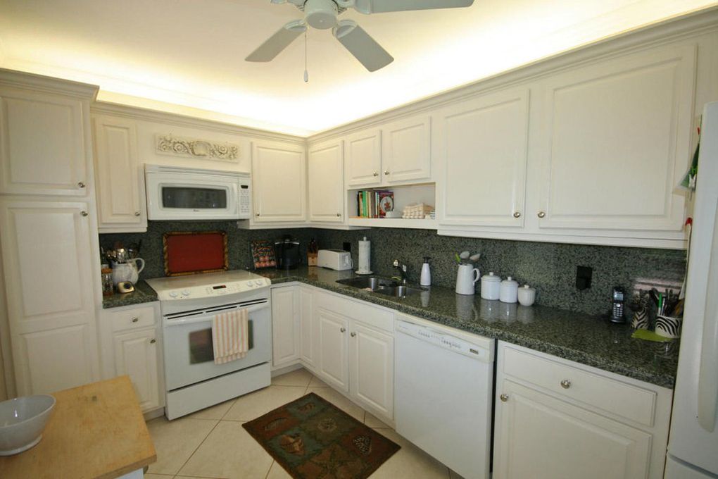 - Kitchen features white cabinetry, overhead lighting, gray granite countertop