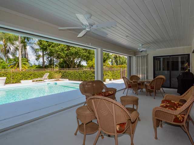 - Wall of windows opens onto a spacious covered lanai and pool area