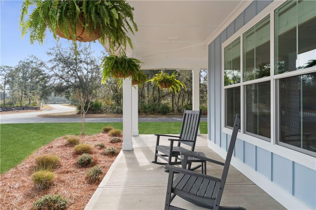 This charming, Coastal-style home at 506 Blue Heron Trail in Sanctuary Cove, GA has a welcoming front porch, an architectural shingle roof and refined exterior details.