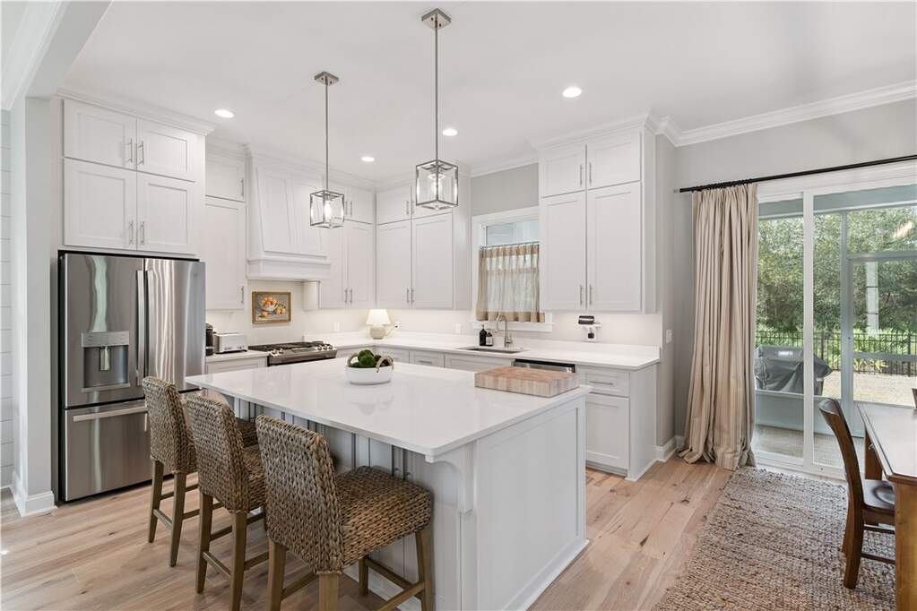 The home’s primary suite is conveniently located on the main floor, while the kitchen anchors the living space with a gas range, custom pantry, and seamless flow to gathering areas.