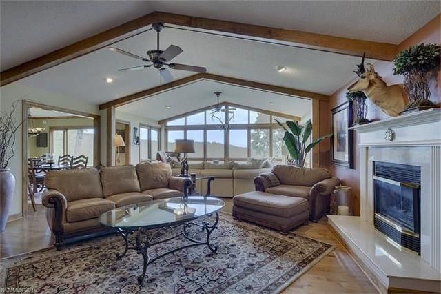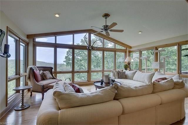 This carefully maintained mountain home affords long-range views of the Blue Ridge Parkway, on a site consisting of two double lots for a total of 1.77 acres.