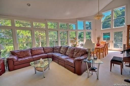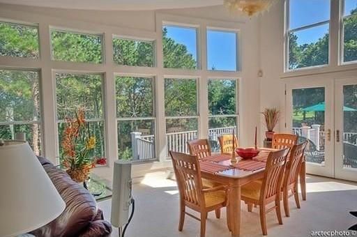 - Living/dining room area with floor-to-ceiling windows gives onto two-tiered deck