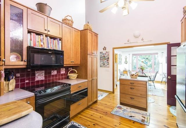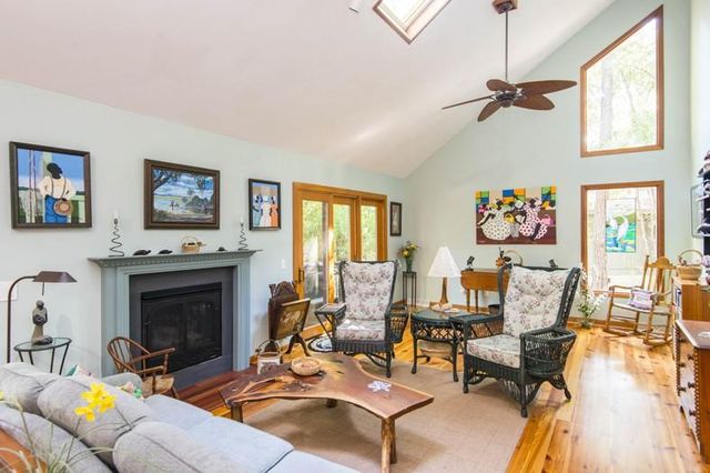 - Living room has vaulted ceiling, skylights, geometric windows and a slate fireplace