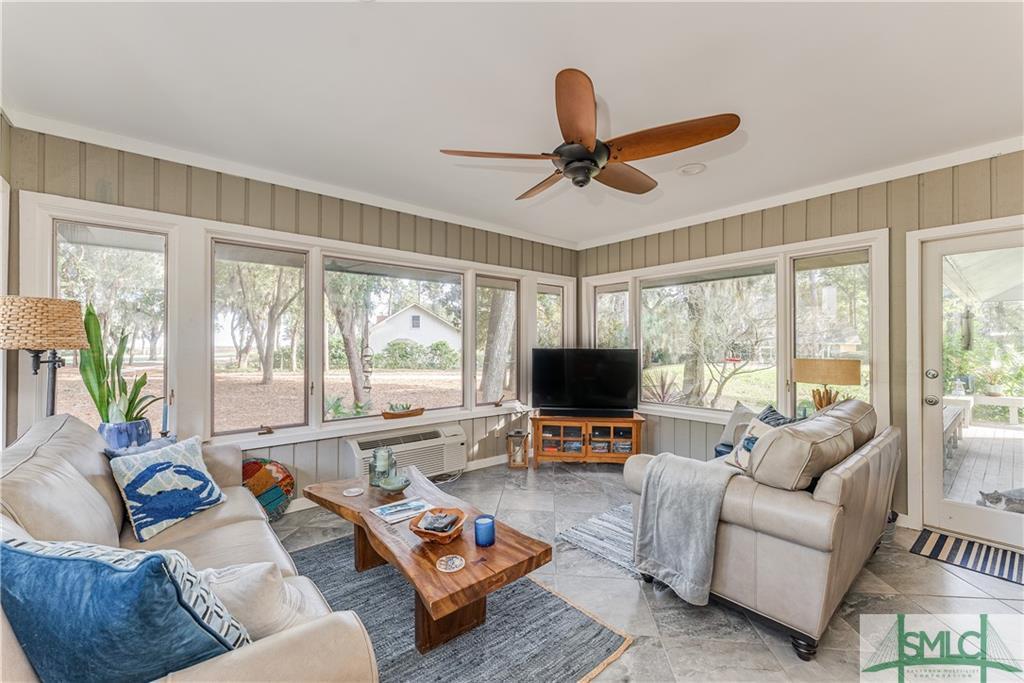 Favored gathering areas include the rear deck and sunroom.