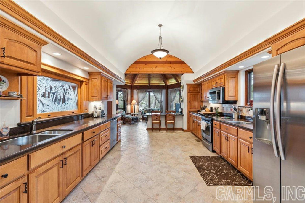 The home’s spacious living room features a gas fireplace, custom built-ins, and more. It flows seamlessly into the gourmet eat-in kitchen, with its stainless steel appliances, custom pantry and Silestone countertops