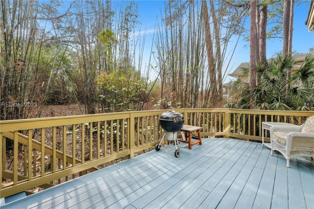 The home offers a spacious deck with wooded views.